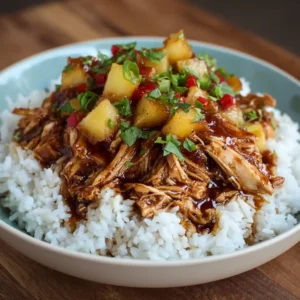 - Party Sliders – Pile shredded chicken onto Hawaiian sweet rolls, drizzle with extra sauce, and top with a slice of pineapple.